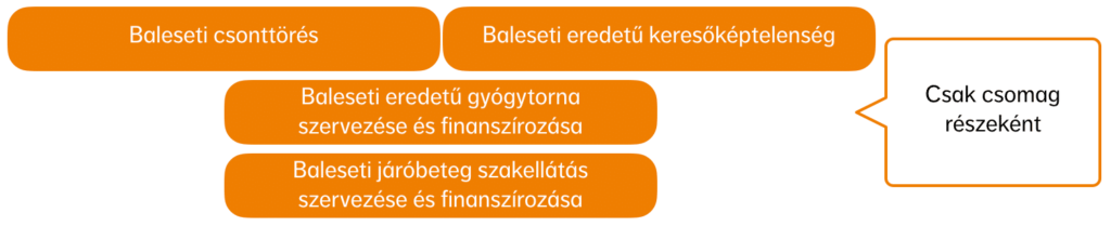 | Baleseti járóbeteg szakellátás szervezése és finanszírozása (956) | A biztosított olyan baleseti sérülése, mely járóbeteg ellátás keretében ellátható: Zárt törés, ficam, megemelés, rándulás, húzódás, bőrsérülés. A szolgáltatás feltétele, hogy a biztosított az ellátási igényt 24 órán belül bejelentse. |